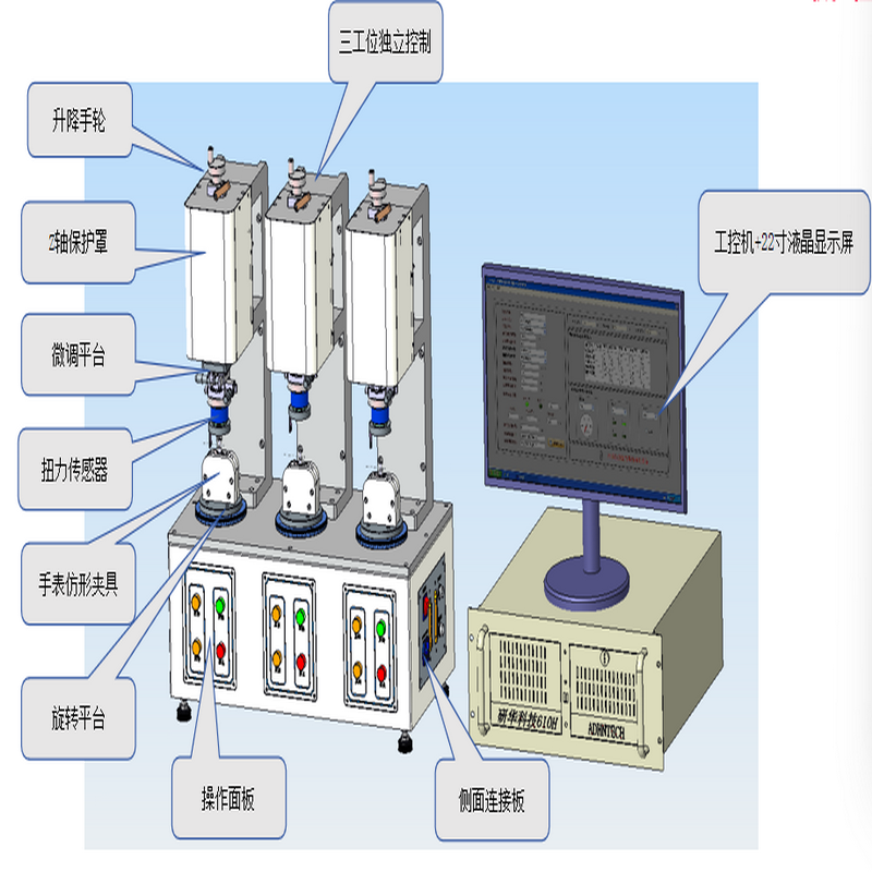 手表旋钮扭力测试设备,采用联往设备专门开发的一套控制软件进行控制,定制高精度扭力传感器进行取样,内部自行开发高速取样硬件,测试时使用砝码进行模拟配重,综合保证产品不同角度,不同力度的测试数据的采集及分析。我司同步开发出三工位扭力测试仪器,有效提升检测效率,节约测试投入问题